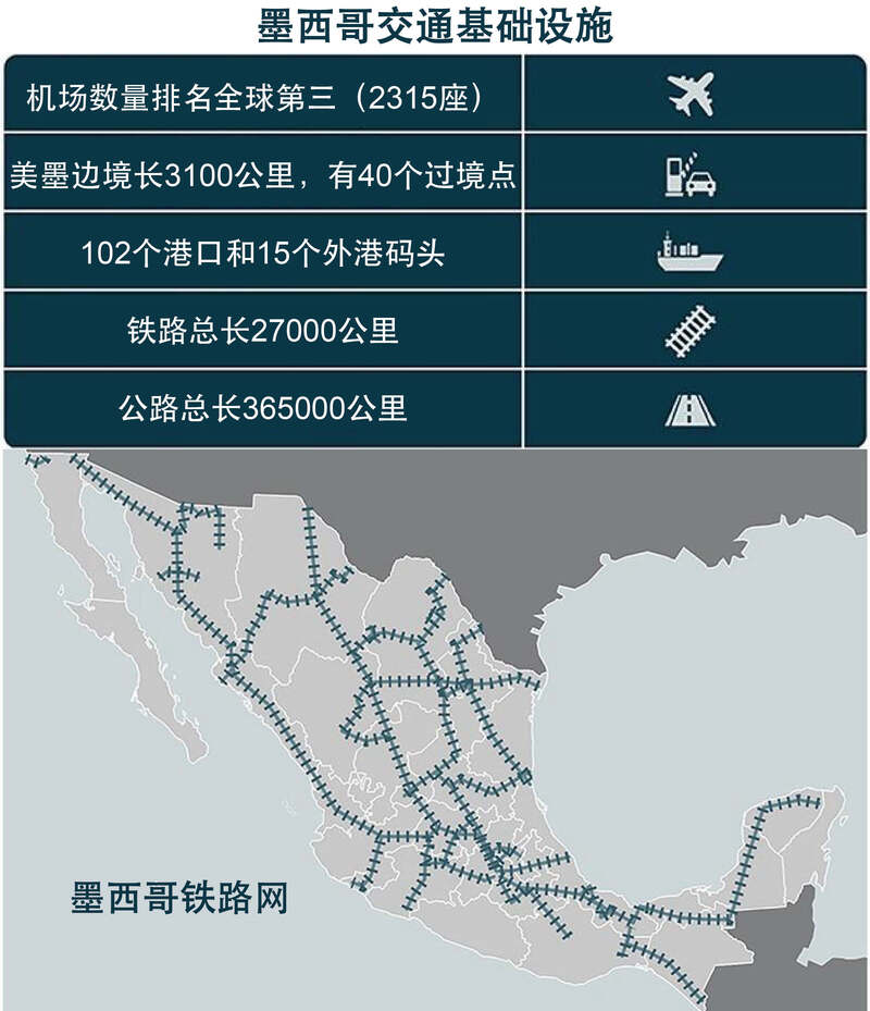 墨西哥全境拥有117个海港,64个国际机场,27,000公里的铁路和172,000公里的公路可用于运输和物流,通常情况下,从墨西哥运出的货物可以在一到四天的时间内到达美国所有地区,而来自亚洲的货物则需要三到五周的时间才能到达美国。
